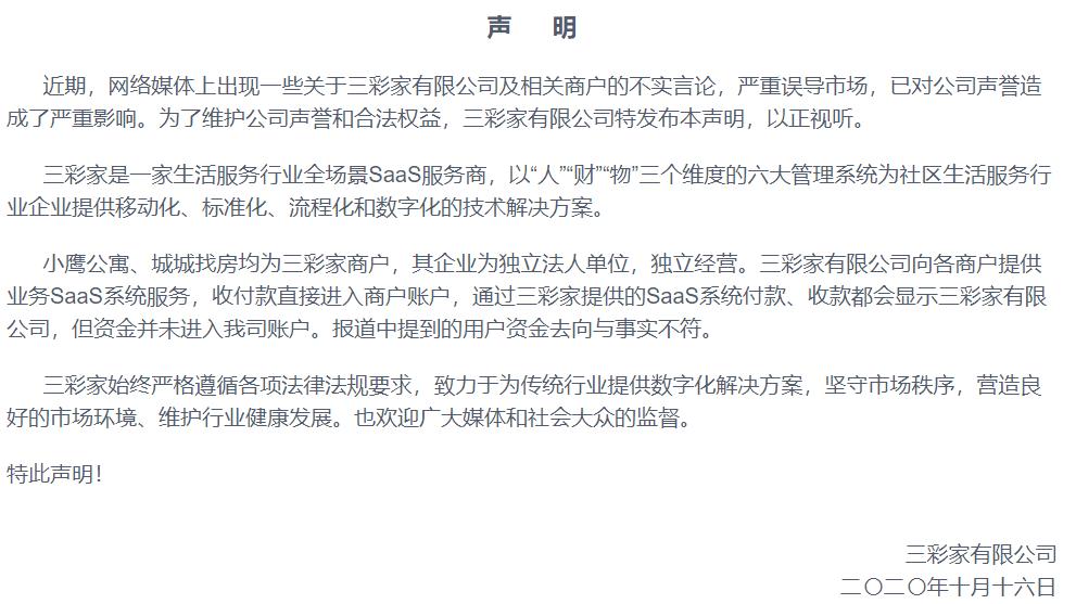 但一切似乎没有想象中顺利。10月16日,在长租公寓平台小鹰找房陷入疑似暴雷风波后,被外界质疑与其存在利益输送的三彩家发布澄清声明,称对方是独立经营的商户,自己只提供业务SaaS系统服务。