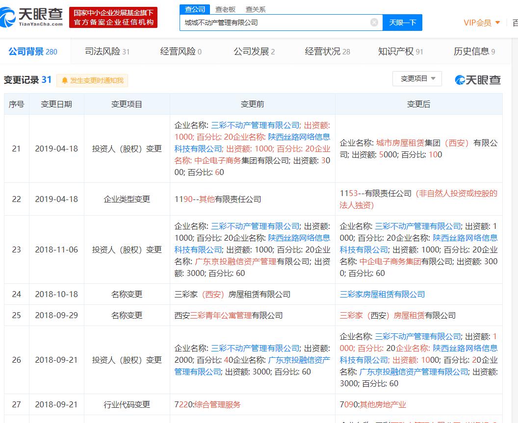 根据天眼查APP,城城不动产全称为城城不动产管理有限公司,股东分别为郝菲、许腾、张智军三名自然人,看似与三彩家没有任何关联,其实,该公司曾用过三彩家(西安)房屋租赁有限公司、西安三彩青年公寓管理有限公司、三彩家房屋租赁有限公司等几个名字,最早的发起人就是文宁旗下陕西三彩商业运营集团有限公司的全资子公司陕西三彩公寓管理有限公司。