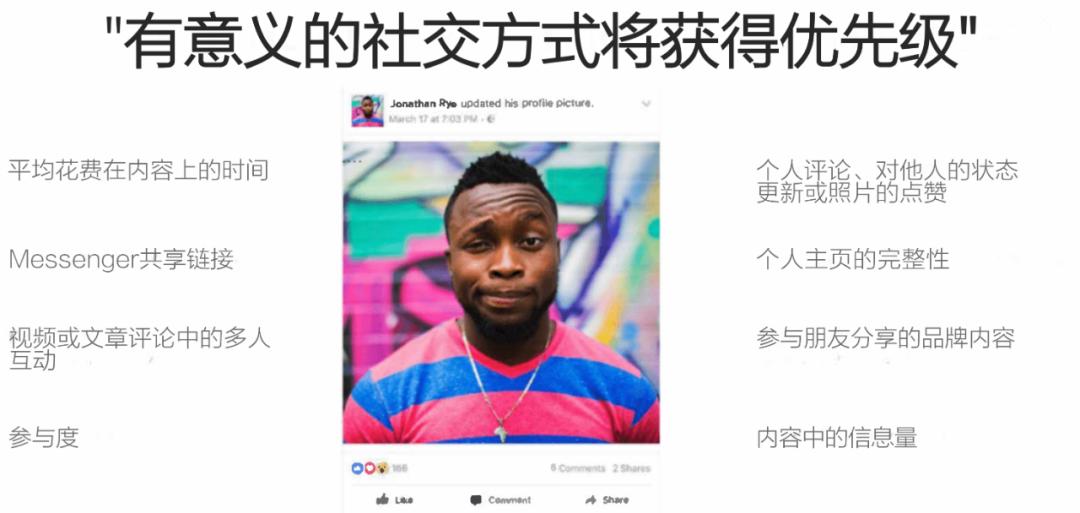 “我们营造的Facebook的方法正在发生重大改变。我改变了产品团队的目标,从专注于帮用户找到相关内容,转变为帮助用户得到更多有意义的社交互动。”