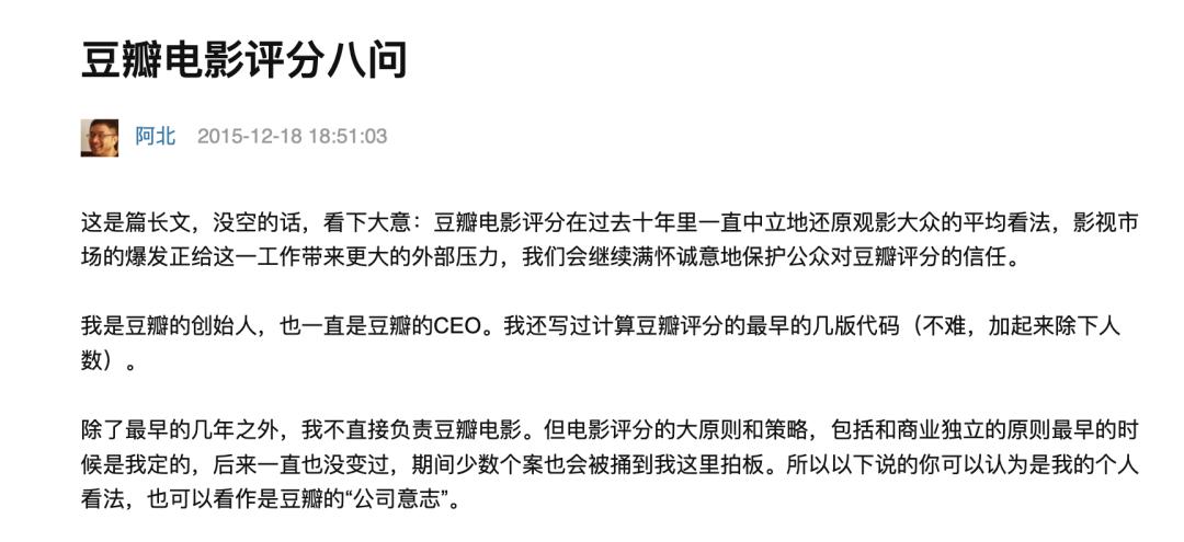 2015年12月18日,阿北在《豆瓣电影评分八问》一文中指出,“我们以前认为提供评分服务需要保持中立和独立是天经地义的事情。”