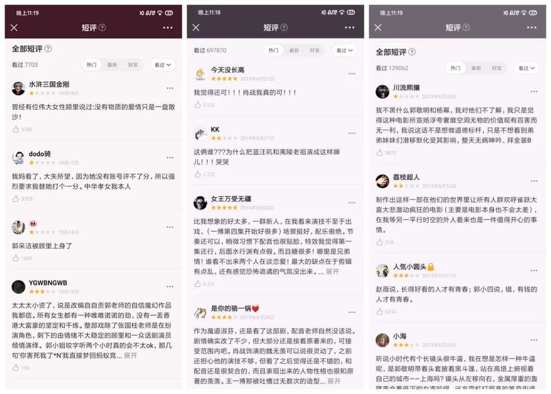 当前豆瓣短评的显示机制为在该片首页依据算法显示4条短评,进入全部短评页面,分为热门、最新、好友,三个维度展示,每个维度能够刷到500条左右的短评内容。