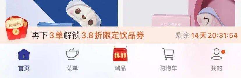 除了每日提高复购,瑞幸还推出了一系列动作:礼品卡、充5送3等活动。在APP和小程序底部,也会不断通过优惠券,刺激用户持续消费。