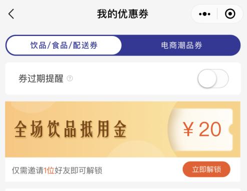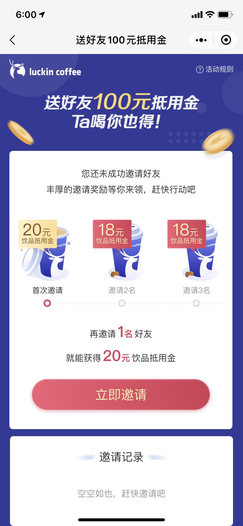 在这一部分,瑞幸主打的策略是鼓励分享——此前的策略是老用户邀一得一,如今是抵用金。