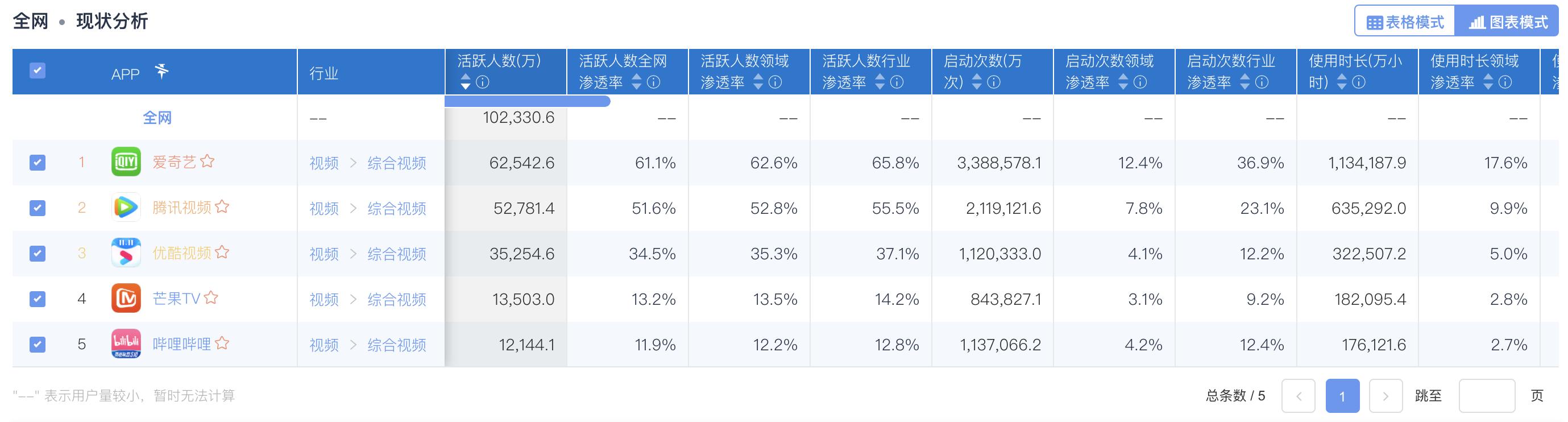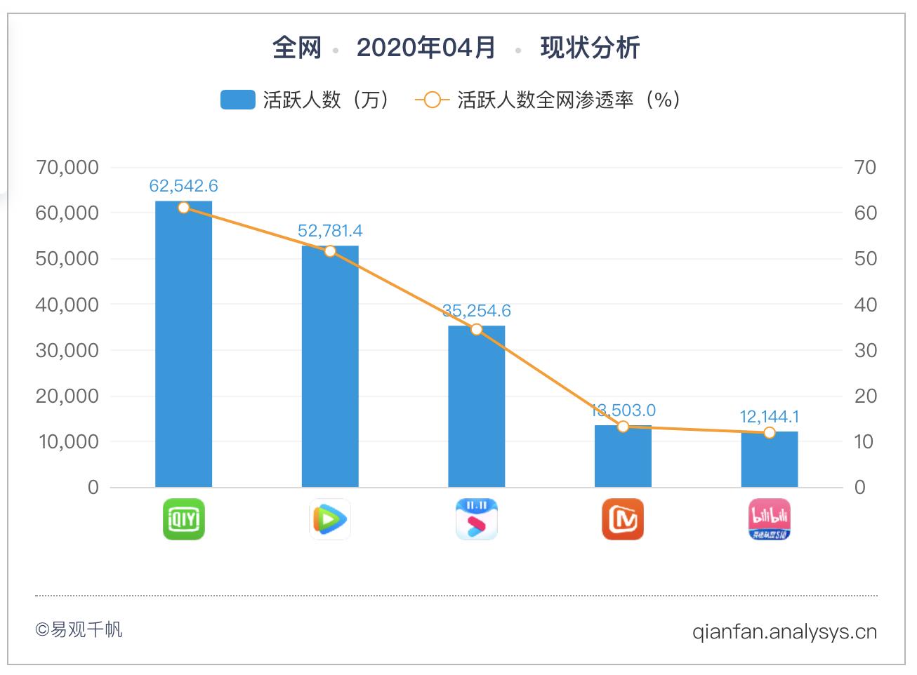 易观千帆 2020 年 4 月数据显示,爱奇艺的各项指标都位居第一,腾讯视频与优酷各居第二和第三。爱奇艺的活跃用户(在所选时间段内,用户主观打开过至少一次 APP,即算活跃用户)数达 6 亿以上,腾讯视频达 5 亿以上,优酷是 3 亿,芒果 TV 则是 1 亿。