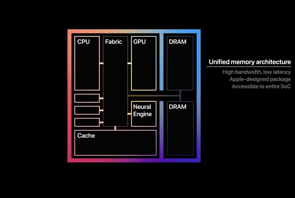 它与iPhone和iPad里面的苹果芯片非常相似,只是功能更强大。它利用了苹果公司的统一内存架构(UMA),这意味着全部内存(DRAM)与需要访问内存的各种部件(比方说CPU、GPU、图像处理器以及神经引擎)都是在同一块芯片上。其结果是,整块芯片都可以访问数据,而不需要在不同部件之间复制数据,也不需要进行互连。对内存的访问有着极低的时延与极高的带宽。其结果是更低功耗、更好性能。