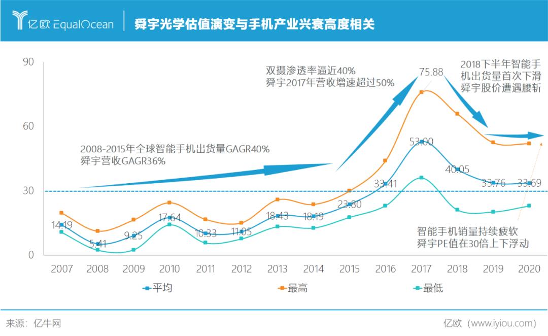 2008-2015年,全球智能手机市场爆发,出货量年复合增速高达40%,舜宇营收年复合增速达36%,市值从5亿元增至198亿元,PE高峰值接近30倍;
