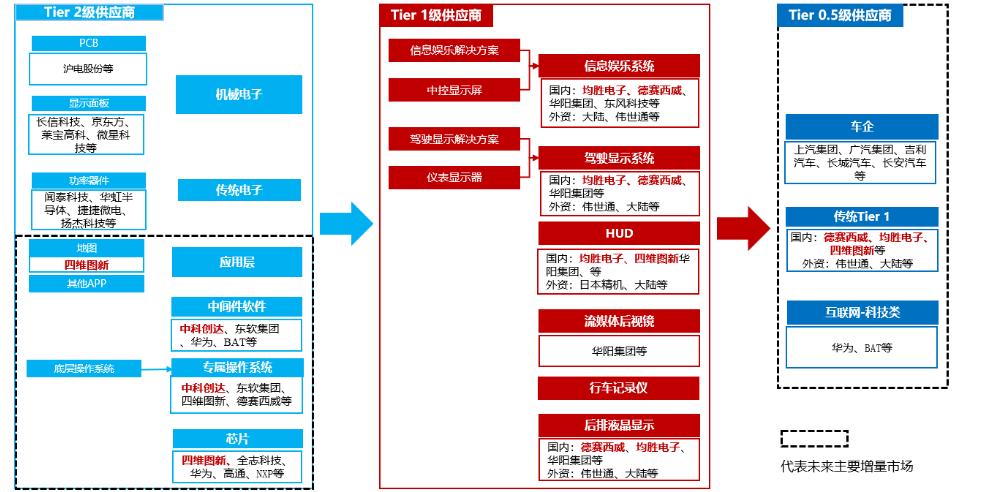 现有智能座舱产业链分上-中-下游三大环节,相比传统电子座舱,智能座舱增加了Tier0.5级供应商的角色。如图4所示,智能座舱的上游主要是Tier2级供应商,负责基础软件和硬件的供应;中游主要是Tier1级供应商,通过整合上游各类软硬件,组装成智能座舱产品,提供给下游集成厂商;下游是指Tier0.5级供应商,是整个智能座舱解决方案的集成商。