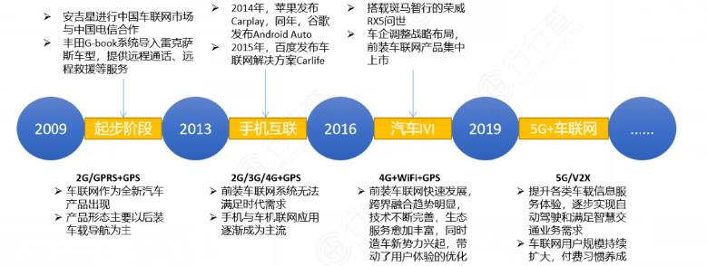 我国车联网起步于2009年,经历了起步阶段(支持远程通话)、手机互联网阶段(与汽车共享手机应用)、汽车IVI阶段(车载娱乐,围绕中控屏展开)和5G+V2X阶段。未来,随着5G与V2X技术的发展成熟,车联网产业成长空间将被打开。