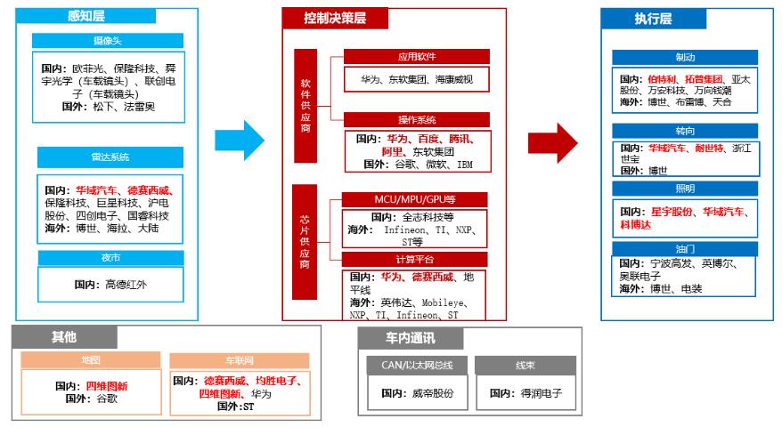 感知层包括环境信息感知、车辆信息感知,主要由各种传感器组成(摄像头、激光雷达、毫米波雷达、超声波雷达等);决策层涉及算法、应用软件与芯片,主要是通过计算对应传感器测量的数据,最后给控制层发出指令;控制层对应动力、制动、转向、灯光四个方面。
