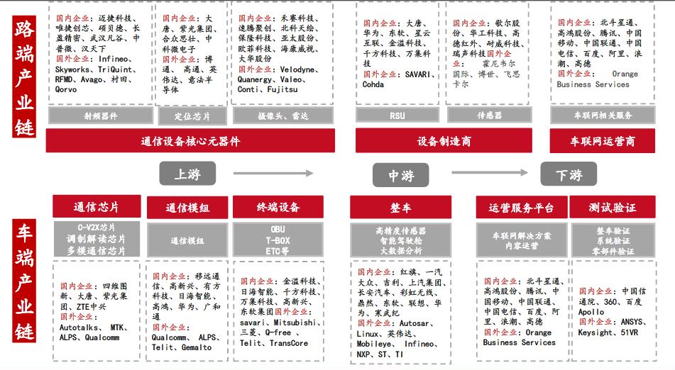 2)在5G和人工智能赋能下,车联网产业链按照“车载终端-路测单元-平台-应用”的产业链顺序依次发展。随着国家对车联网行业政策支持加大,目前以政府引导的路侧单元建设为主力,开启车路协同建设。试点示范区井喷,带动高速公路&城市交叉路口RSU(路侧通信网关)部署将受益;