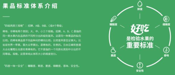 在这点上,百果园的解决方案是:根据水果的肉质、糖度、外观、规格,将产品分为“招牌、A、B、C”、“大、中、小”一共12个等级,建立自己的果品标准体系,并采购、配送、安全、运营方面实行标准化流程运作。同时对上游的水果生产进行严格把控,向果园派驻技术人员以指导果农进行科学培育、采摘,以保证既有能衡量产品的标准,也有能符合标准的充足产品。
