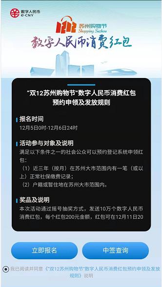 苏州央行数字货币红包隶属于“双十二苏州购物节”活动,总金额2000万,每个红包200元,共计10万个红包。红包采取“摇号抽签”形式发放,抽签报名通道自2020年12月5日0时正式开启,持续至12月6日24时。参与活动的市民可在 “苏周到”APP进行报名预约抽签。12月11日公布中签结果,中签的市民可根据“苏周到”APP站内信息的指引下载“数字人民币APP”,领取数字人民币红包,数字人民币消费红包在12月12日-12月27日都可以使用。