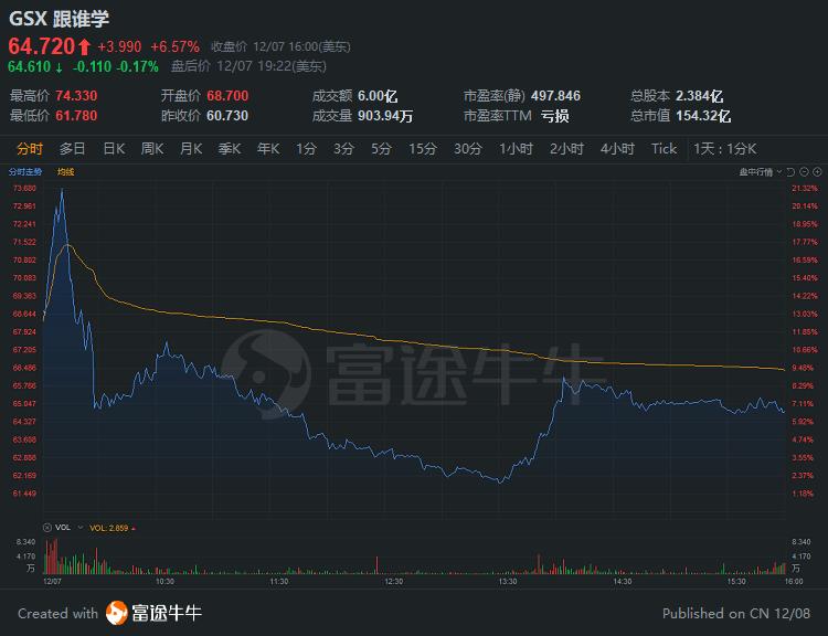 跟谁学周一开盘一度高涨20%,后涨幅收窄,收涨6.57%。