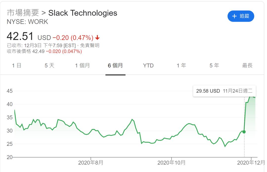 以上就是为什么投资者对Slack态度冷淡的原因,甚至已经开始恶化——在Salesforce收购Slack的消息泄露前,Slack的股价自上市以来已经消失了约四分之一,甚至在疫情期间,也没有太大的增幅。与之相比较,其它“线上办公”公司的股价如Zoom则在今年3月之后大涨特涨。