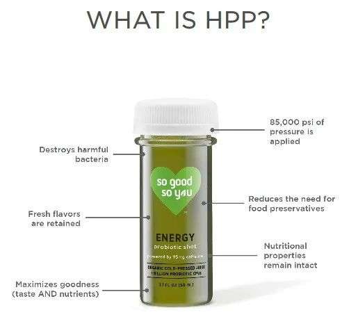 我们查询资料得知,So Good So You采用的是高压灭菌(HPP),这是一种冷处理技术,在较低温度下对食品进行加压处理,使微生物的蛋白质变性、酶失活、细胞破坏,且高压灭菌时间较短。