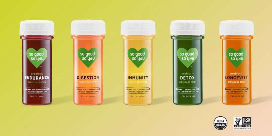 而So Good So You的果汁饮料中就完美契合了天然、植物基、便携小巧等多种需求。其品牌主要有两条产品线,一条是shot型益生菌果汁饮料,另一条是瓶装果汁饮料。