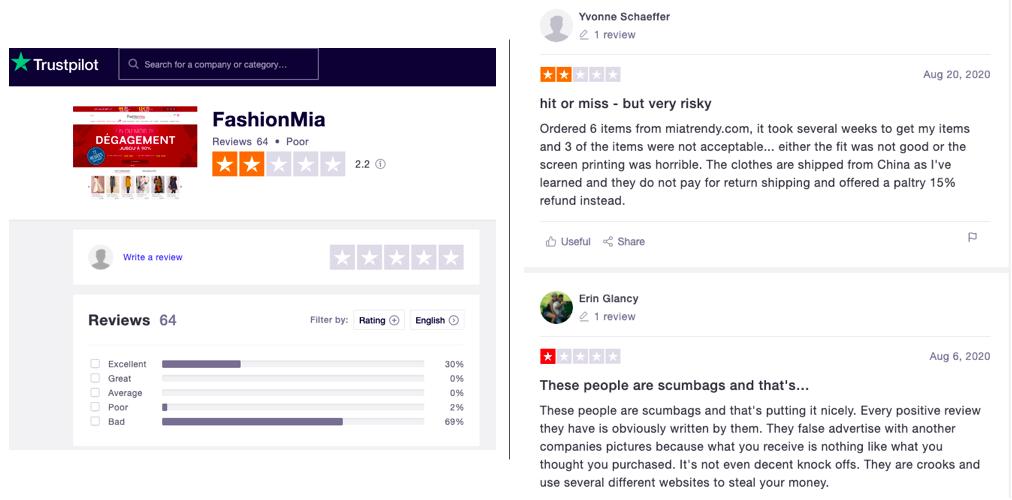 以澳鹏为例,澳鹏旗下首个女装品牌FashionMia在评论网站Trustpilot中的消费者评价仅2.2星,如图: