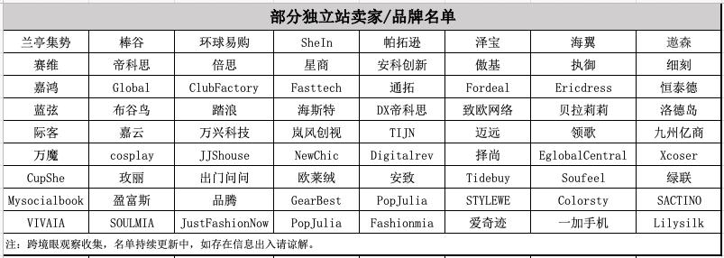 以下为《跨境眼观察》收集的部分独立站卖家/品牌名单,不管是产品还是营销,希望给予想要入局的卖家以参考。