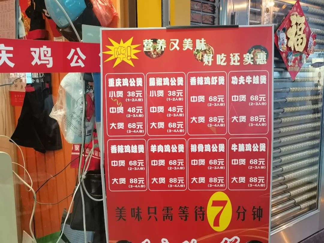 比如鸡煲店,这种一般得吃1个小时,位于中间位置的炭炉鸡煲标价78元,是整条巷子的冠军,拿下56个顾客