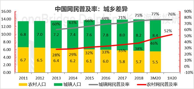 (1)首先,从此次疫情黑天鹅的效果来看,即使有疫情这种极端事件的刺激,城镇的网民普及率并无明显提振,主要的新增是在农村地区,这也意味着城镇未来增量网民的空间已越来越小。从当前农村地区 52% 的网民渗透率来看,中期新增网民会持续来源于下沉市场和农村地区。