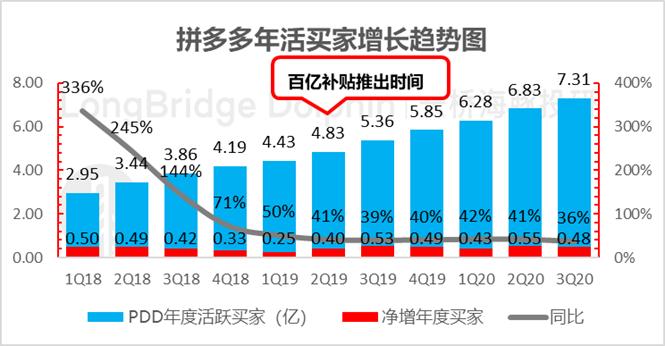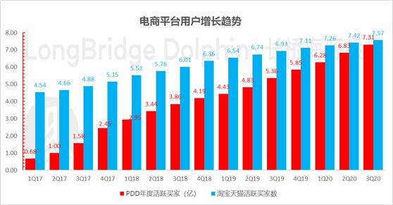 到今年第三季度,拼多多的年度活跃买家数 7.31 亿,与淘宝天猫的年活买家数 7.57 亿,仅仅相差了 2600 万。