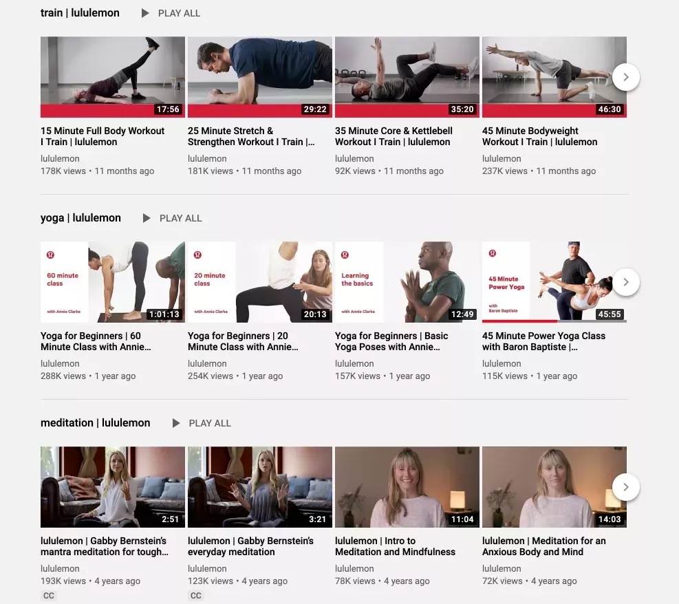 Lululemon在美国优酷上拍摄的瑜伽教学视频,其质量足够当作收费产品。品牌聘请专业的瑜伽教练和视频制作公司,输出业内顶尖的瑜伽教学课程,居然还是免费的。这对建立潜在顾客对Lululemon的好感作用巨大。
