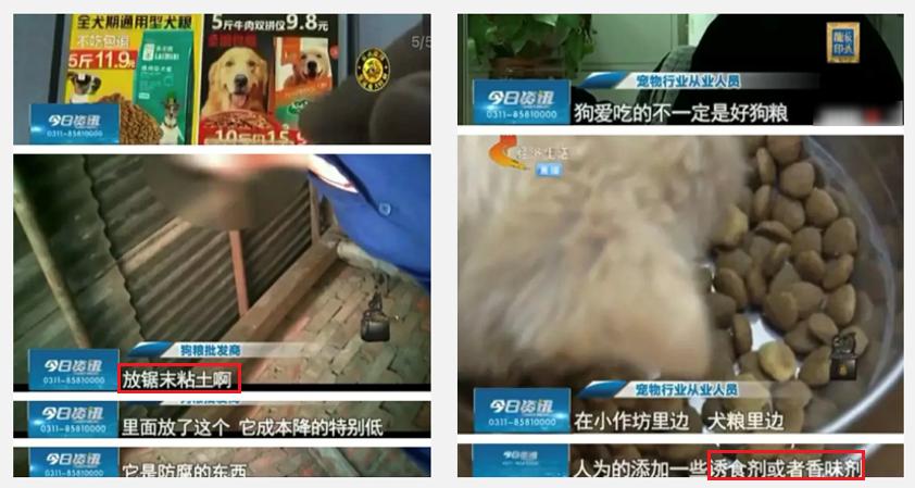 为了拉低价格,它们在宠物粮里掺杂了各种垃圾原料,例如秸秆粉、玉米麸皮、锯末粘土,甚至还用病死的肉冒充好的牛肉、鸡肉。