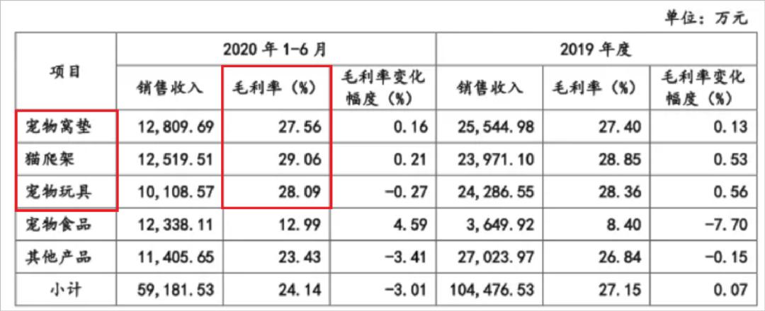 还有一家叫天元宠物的公司,主要卖猫爬架、宠物玩具还有宠物窝垫,它们家刚提交的招股说明书,也标明今年上半年这些产品的毛利率都接近 30%。