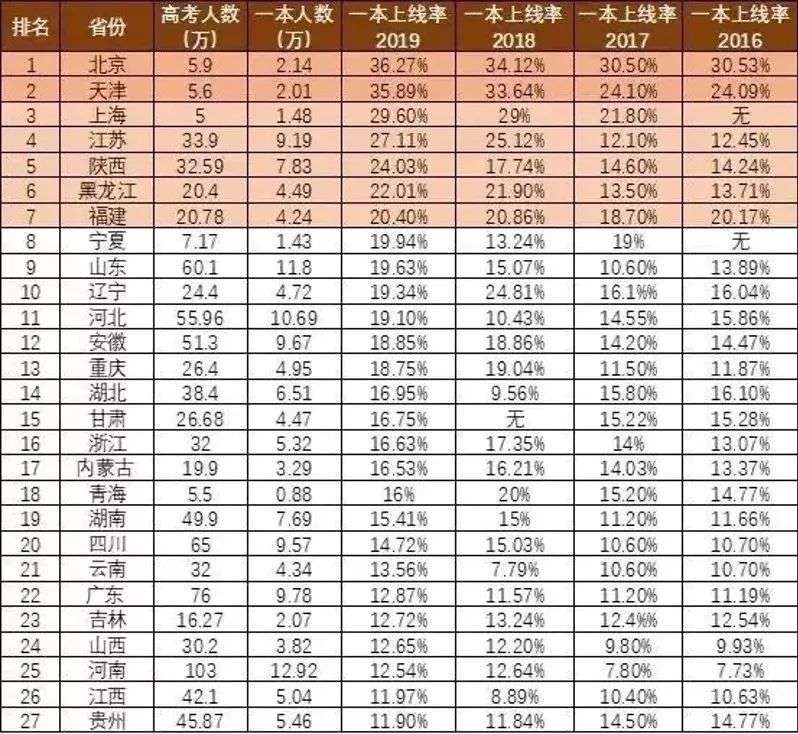 2016-2019年全国高考一本升学率
