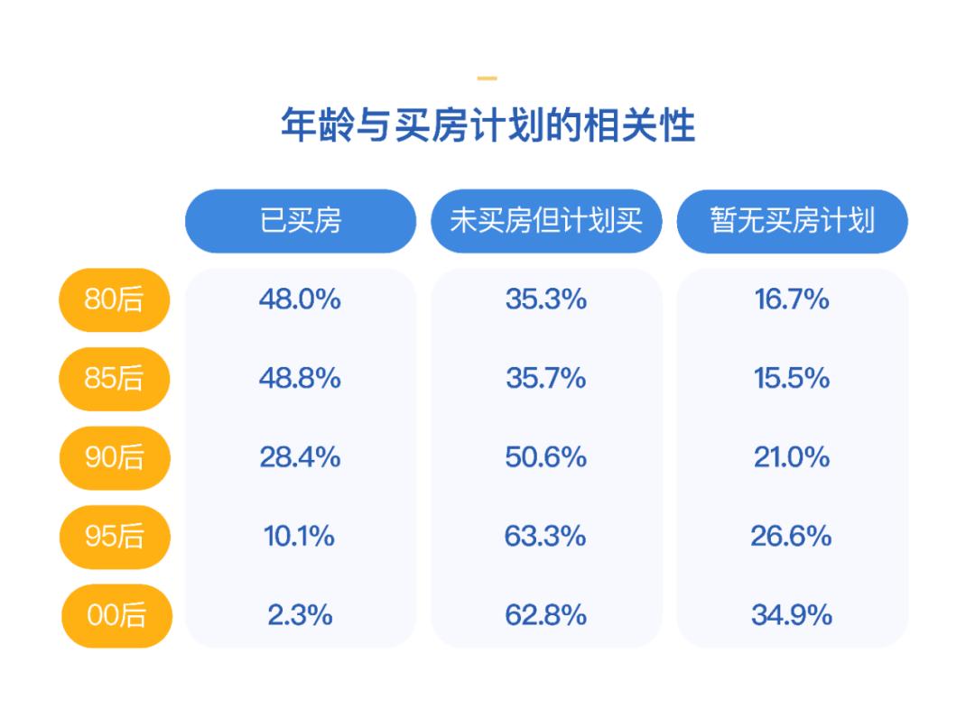 值得注意的是,80后、85后中有48%已买房,而90后中也有28.4%,95后中10.1%已买房,甚至还有2.3%的00后已经拥有了自己的首套房。那么,你买房了吗?(狗头)