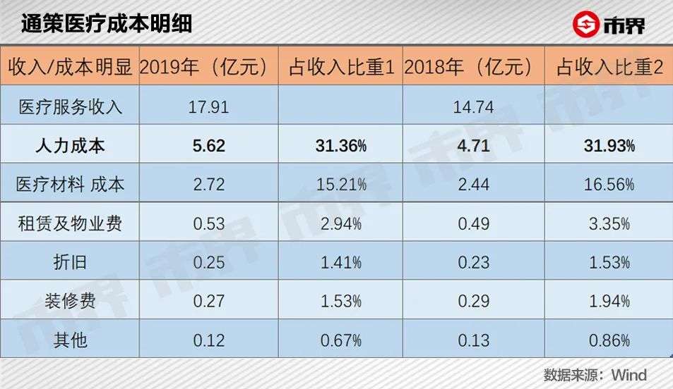 从通策医疗2018年和2019年的收入和成本明细中可以看到,占收入比重最大的是人力成本,占比达到31%以上,其次是15%-17%的材料成本,再往下就是占比在3%及以下的租赁费用等等。