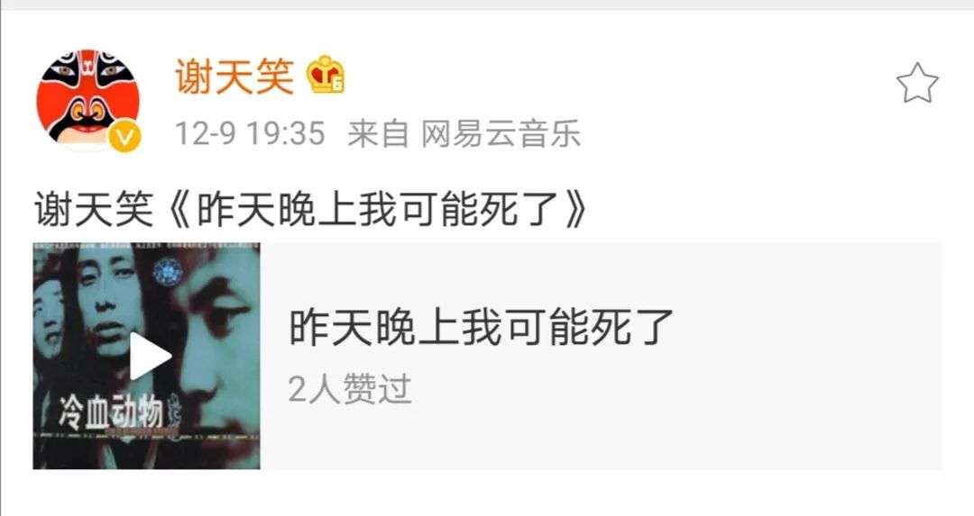 当然,这也不是一场成功的演出,谢天笑本人也是心中有数。演出第二天,他在微博分享了自己的一首老歌,歌名叫《昨天晚上我可能死了》。