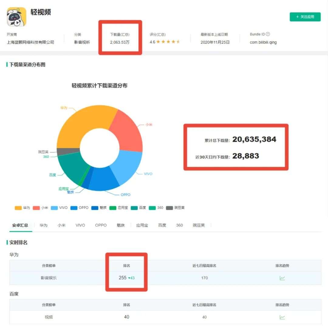 轻视频累计下载量、榜单排名 来源|七脉数据