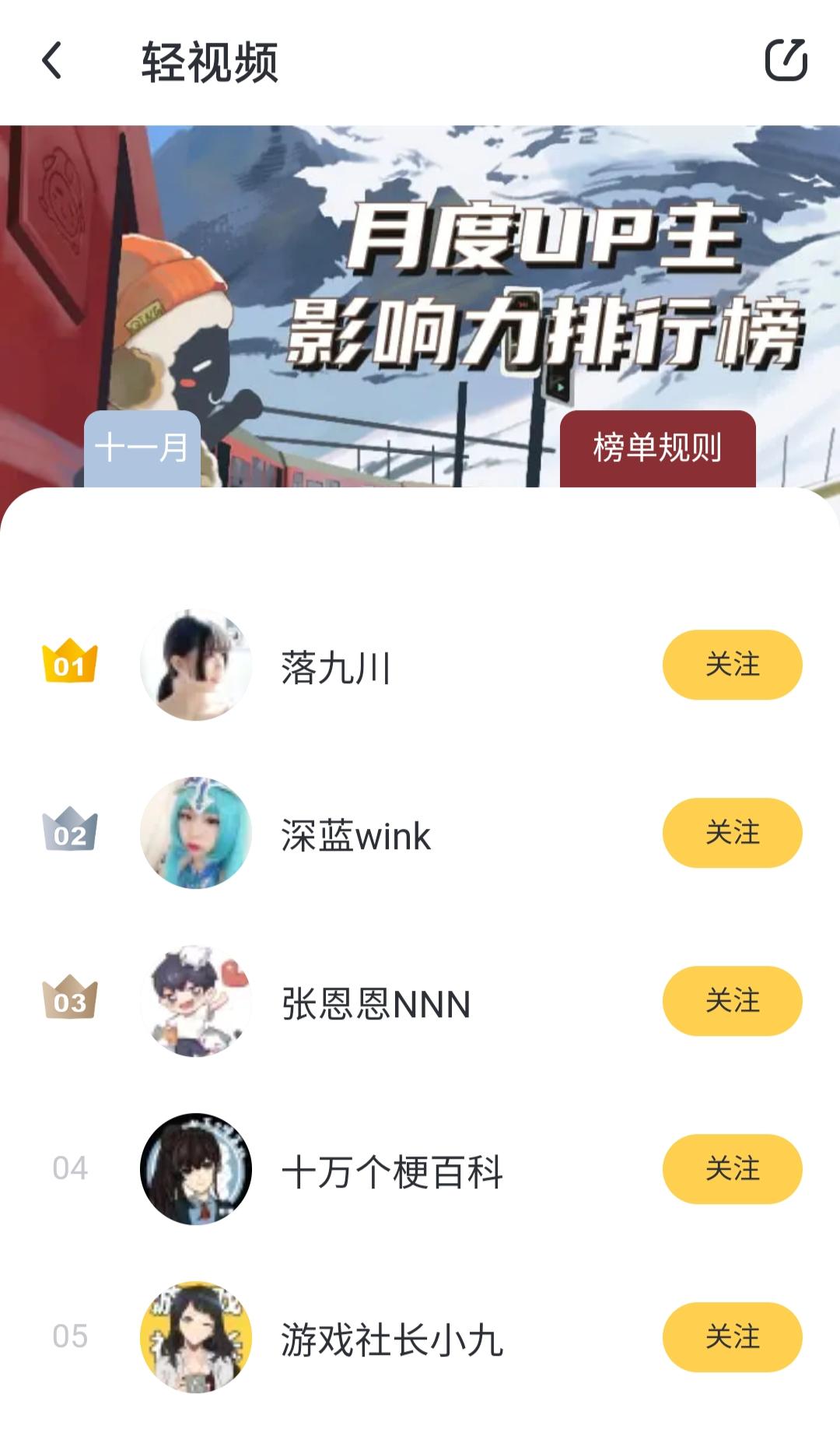同时由于B站原生用户调性,轻视频的总体ACG含量较高,轻视频11月“月度up主影响力排行榜”中,前10名有6名属于ACG领域。