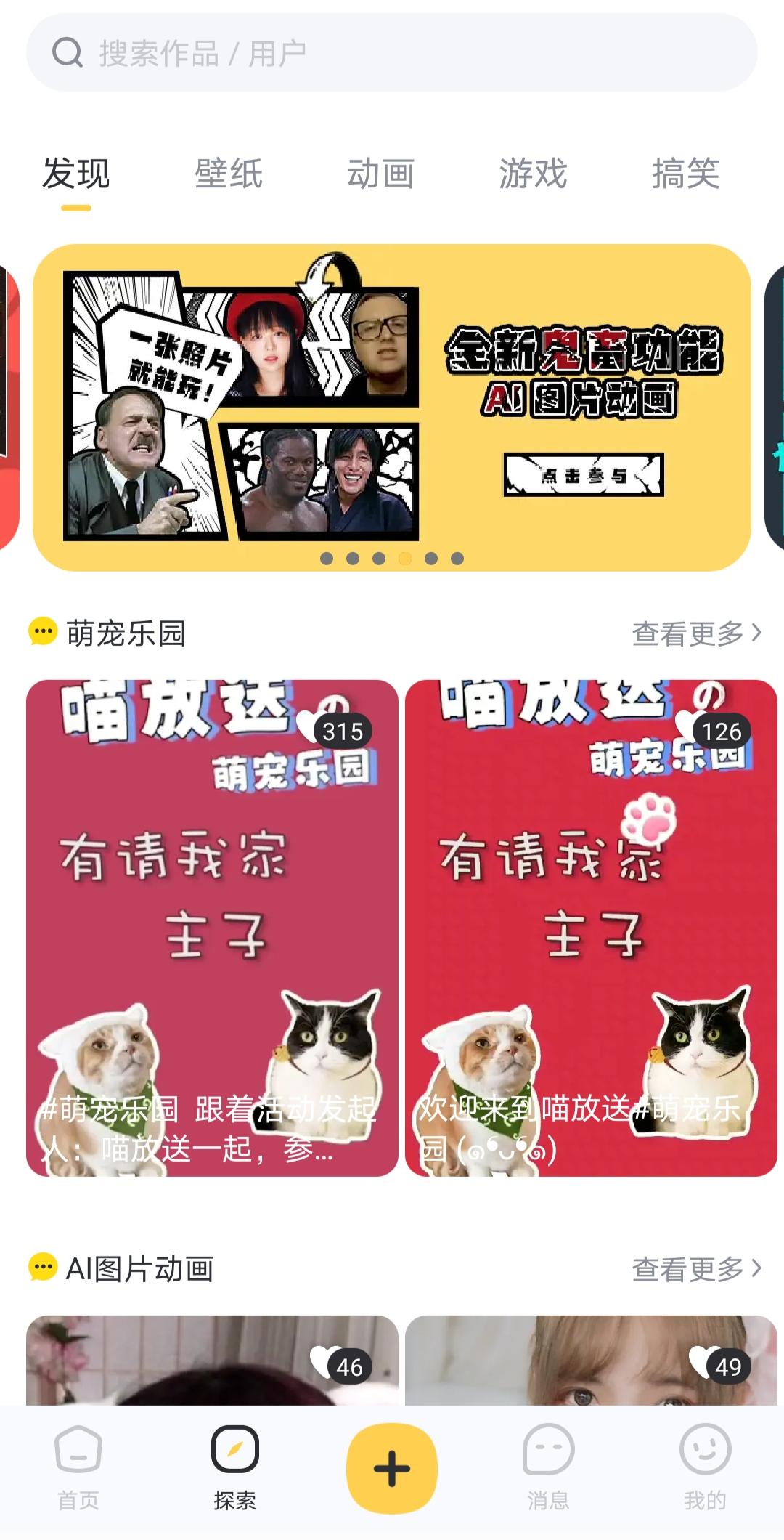 在轻视频的主界面,探索区是轻视频“发现宝藏”的入口,分为“动画”“游戏”“搞笑”“音乐”“国风”“生活”“壁纸”几大栏目,和主站分区相似度较高,可以看出,轻视频延续了B站的内容风格。