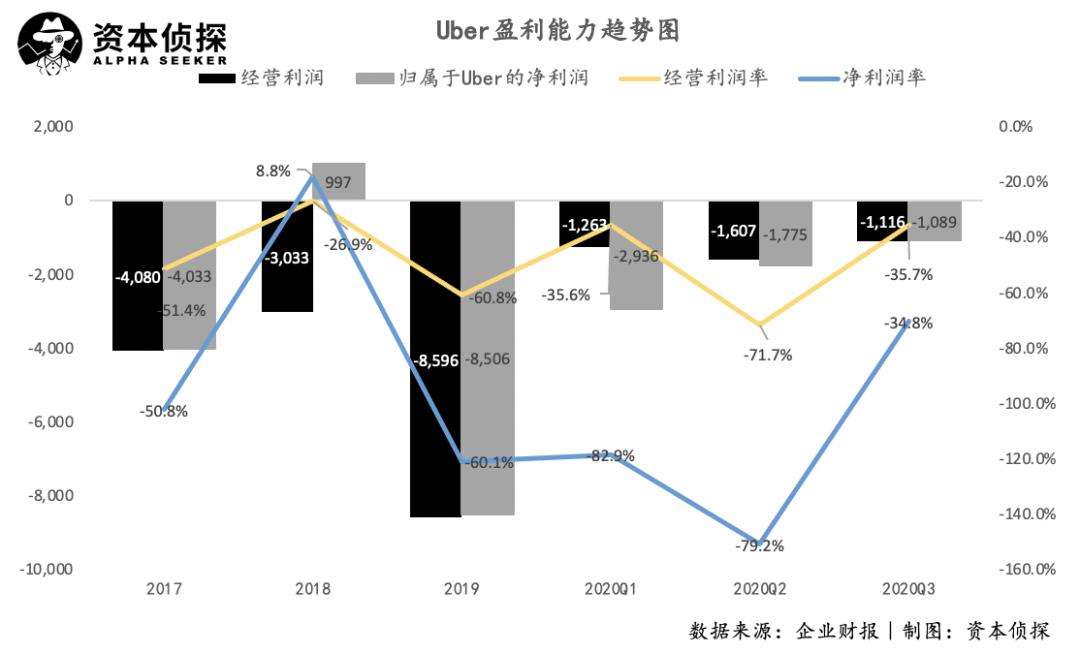 根据财报数据,今年以来,Uber无论是营收成本,还是营销、研发等经营费用,都维持在低位,这最终反映为Uber经营利润率的上升:除了遭受疫情重创的二季度,一季度、三季度Uber的经营利润率相比2019年数据都出现了较大幅度的修复。
