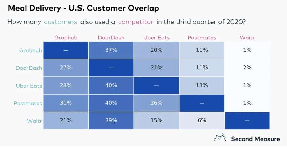Second Measure的数据显示,美国五家外卖服务平台互相之间存在重合客户