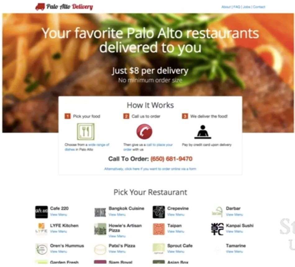 Stanley Tang曾经在一次斯坦福的演讲中回忆过项目开始的过程。2012年10月,当时四个人在帕洛阿托的一家食品店和老板娘交流,询问他们为小企业主制作的应用程序是否好用,但发现并不解决他们的痛点。老板娘抱怨自己有很多订单,但是人手不够,无法送达。他们随即上线了”PaloAltoDelivery.com”——在餐厅不知情的情况下,上线了周边餐馆的菜单,提供送餐上门的服务,并留下了自己的电话号码。如果有人下单,创始人们会自己送餐,并在上课的时候暂停服务。项目上线5个月之后,获得Y Combinator种子轮投资。2013年6月,项目正式更名为DoorDash。