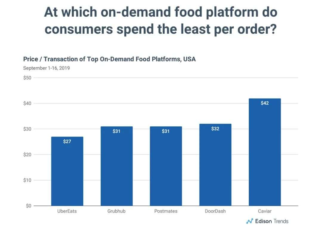 Edison Trends数据显示,基于2019年9月的数据,美国外卖平台中,Uber Eats的平均客单价最低为27美元,聚焦中高端餐厅的Caviar客单价最高为42美元,DoorDash排名第二高,达到32美元。
