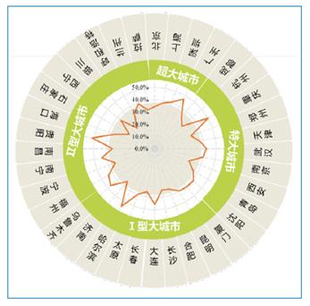 特大城市中,4成未达到同等规模城市的平均水平;10座Ⅰ型大城市,虽然表现都在36城平均线以上,但值得注意的是,未达同规模城市平均水平的5座城市,分别来自中部(长沙、合肥)及东北地区(哈尔滨、长春、大连)。