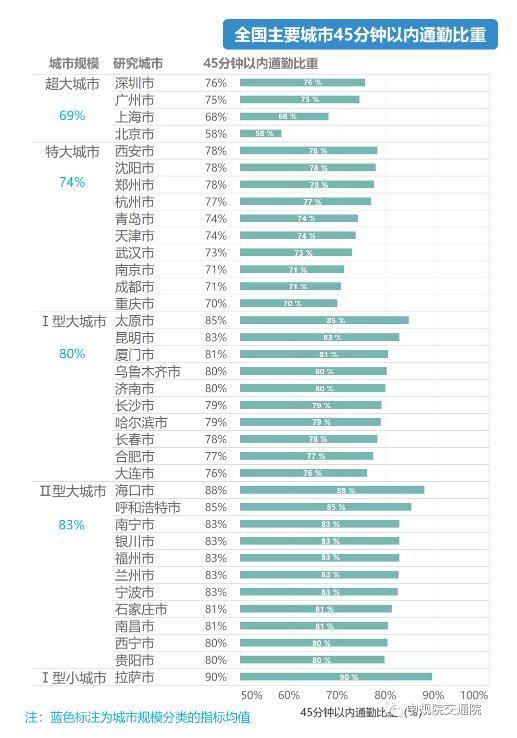 整体来看,城市规模规模越大,45分钟以内的通勤比例均值越低。具体而言,超大城市、特大城市、Ⅰ型及Ⅱ型大城市的平均比重依次上升,分别为69%、74%、80%和83%。