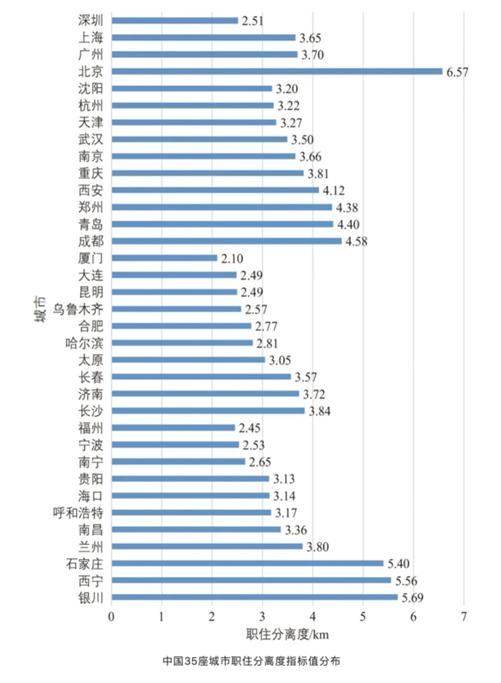 研究发现,全国35座主要城市中,北京以6.57km的职住分离度排在第一位。这一数据,已接近上海和广州的2倍,是深圳的约2.6倍。