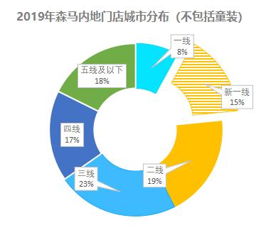 赢商网从大众点评获取的大数据显示,2019年森马内地三线及以下城市门店占比约为58%。