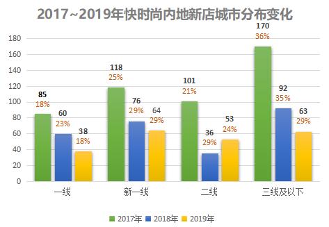 而三四线城市拓店数虽逐年微增,但占比始终徘徊在35%以下。在消费增速持续高于一线,且日渐反超二线的三四线城市,快时尚们的下沉步伐明显配不上野心。