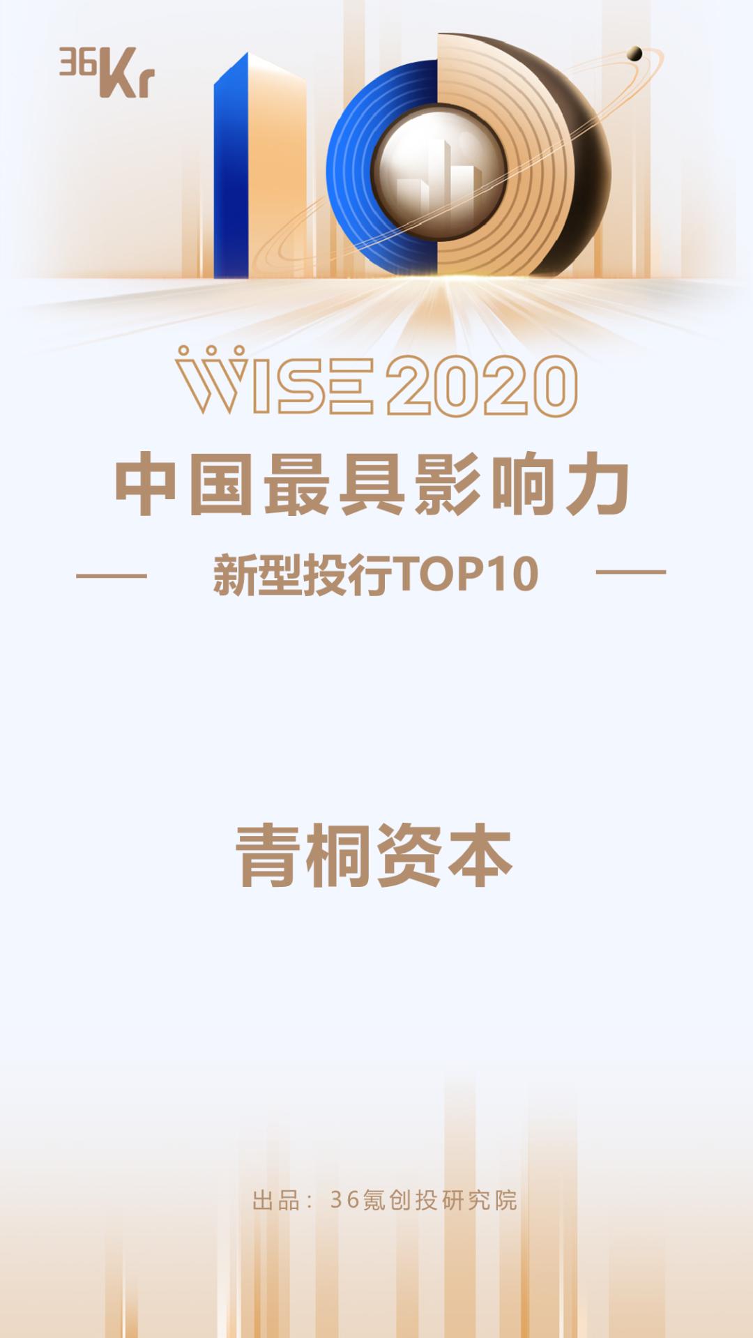 12月8日,36氪发布“WISE2020新经济之王”系列榜单。在年度第三方机构榜单中,青桐资本荣登WISE2020“中国最具影响力新型投行TOP10”,并位居前5。这也是青桐资本继2019年后再次入选该榜单。
