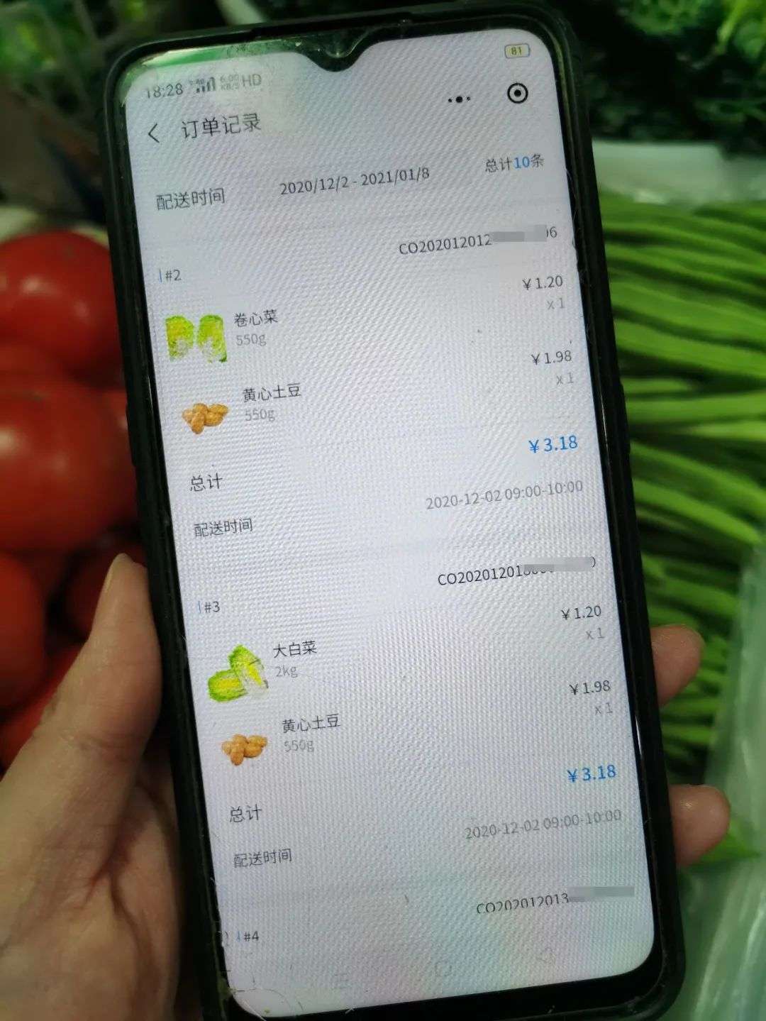一位卖蔬菜的摊主通过菜场商户小程序“淘菜猫云商户”向记者展示了最近一周的订单,总共10笔,大部分集中在特价菜土豆与卷心菜上。