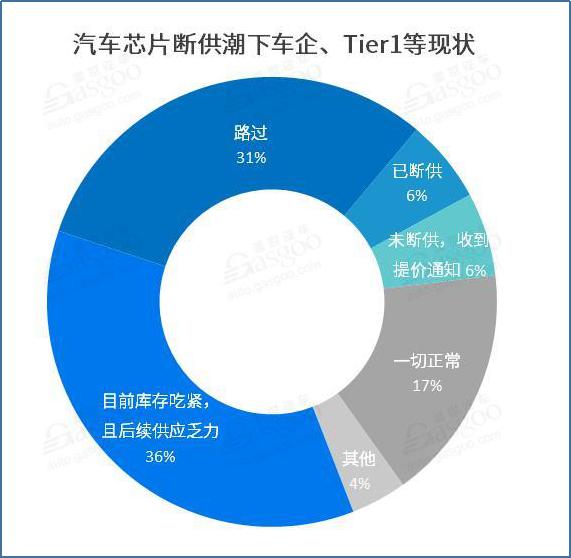 盖世汽车网的一份调查显示,在一份1600余人次参与的调研中,48%的参与者表示其所在企业均遇到芯片库存紧张、断供或是涨价等情况,仅有17%的参与者认为目前供应一切正常。