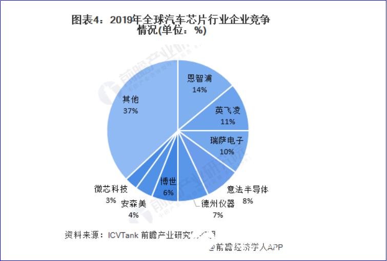 根据前瞻产业研究院的数据,2019年恩智浦、英飞凌、瑞萨、德州仪器和意法半导体保持汽车芯片厂商的前5名,这五家企业的市场份额占比合计达50%。