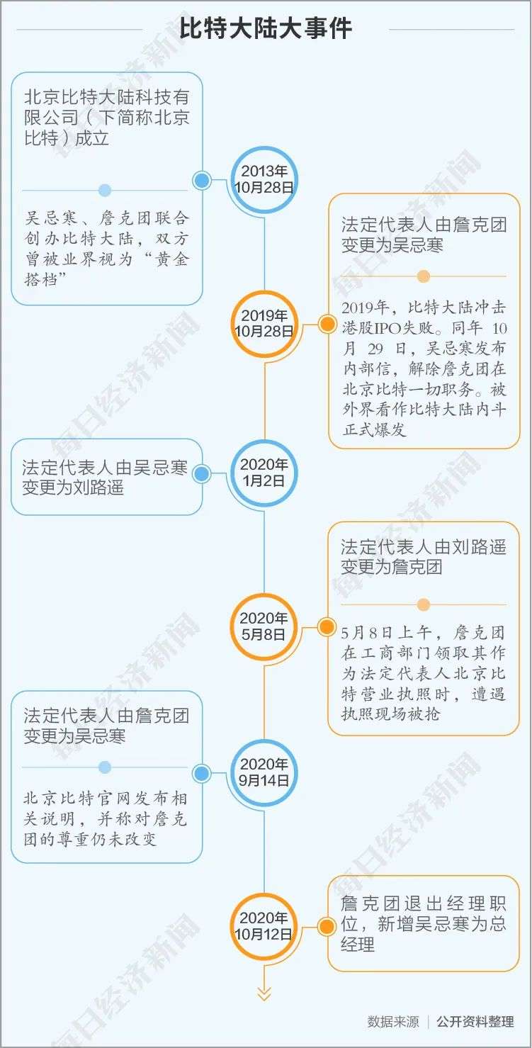 9月15日,国家企业信用信息公示系统显示,北京比特法定代表人变更为吴忌寒。同日,北京比特官网发布说明,“北京比特”已于9月14日重新在市场监督管理部门领取了公司营业执照,营业执照载明吴忌寒为北京比特法定代表人。与此同时,对詹克团的尊重仍未改变。