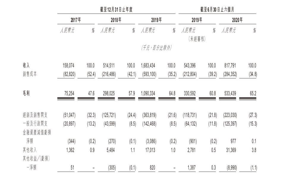 与此同时,可观的利润率与持续增长的消费市场也为泡泡玛特带来了漂亮的成绩单。招股书显示,2017年、2018年、2019年及2020年6月30日,泡泡玛特的毛利率分别为47.6%、57.9%、64.8%及65.2%。同时期内,泡泡玛特营收分别为1.58亿元、5.14亿元、16.83亿元及8.18亿元;净利润分别为156万元、9952万元、4.51亿元及1.41亿元。